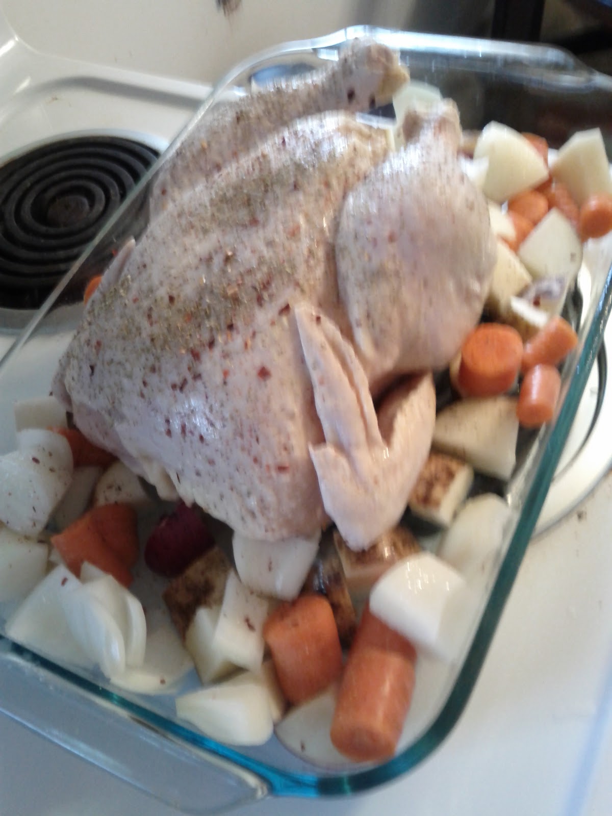 Put everything in a dish. Sprinkle with seasonings. Drizzle with just a small amount of oil. Cook uncovered, 350 degrees for 1 hour to 1 /1/2 hours.